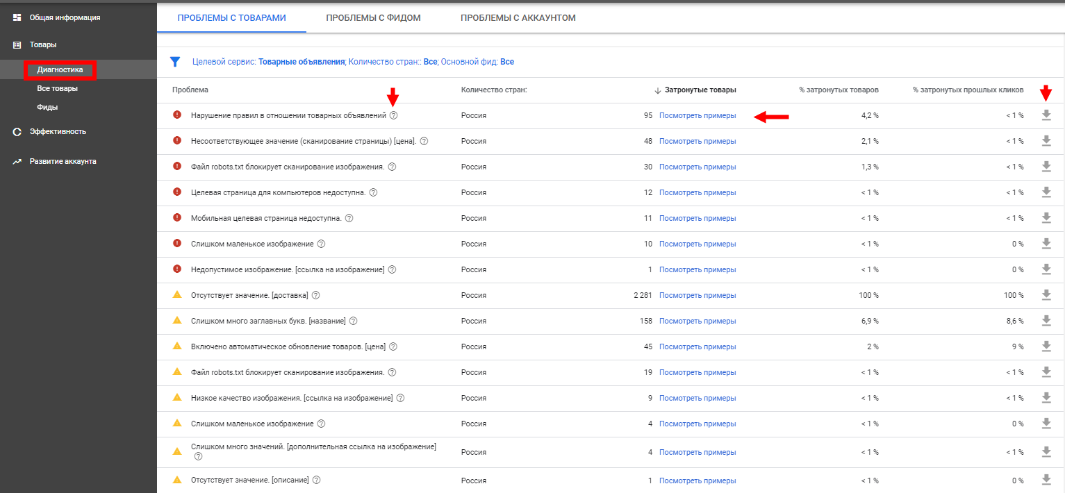 Чтобы выйти из бана, нужно определить и устранить причину попадания в него. Главный инструмент выявления проблемы фида — вкладка «Диагностика» в аккаунте GMC. Здесь находится сводный отчет на уровнях товаров, фидов и аккаунта. Вкладка показывает информацию о причинах ошибок и позволяет скачать затронутые товары в таблице с ID товаров и причинами отклонения.