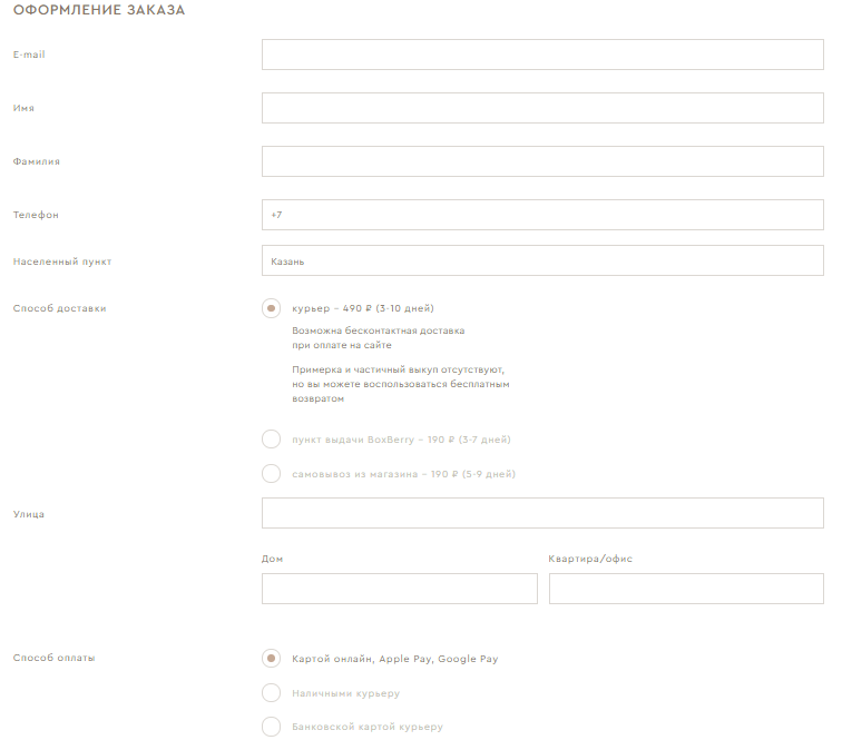 Пример правильной страницы оформления заказа. Указаны все возможные способы доставки и оплаты.