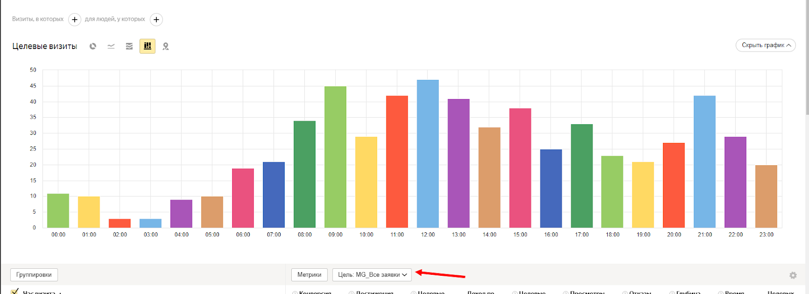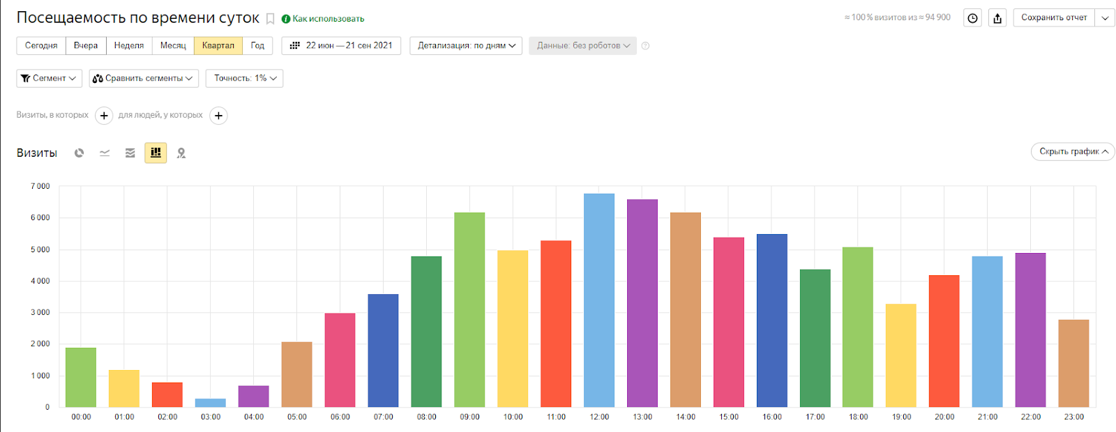 Отчет показывает распределение трафика на сайте по времени суток. По отчету можно определить, в какое время посещаемость сайта достигает максимума, в какое время посетители охотнее всего оставляют заявки на сайте. Эти данные можно использовать при оптимизации рекламных кампаний: например, если вы продвигаете услугу доставки пиццы и видите, что конверсии происходят с первого касания с 11:00 до 15:00 в будние дни, то можете показывать рекламу только в это время.