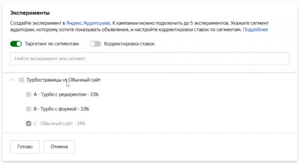 Яндекс рекомендует копировать исходную РК и проводить эксперимент с копированными кампаниями. То есть если вы собираетесь использовать 3 сегмента, то копируете исходную РК 3 раза и выключаете ее, но скопированные кампании пока не включаете.