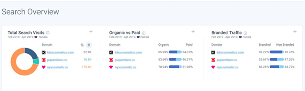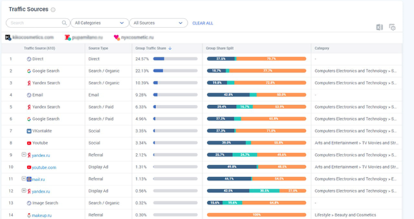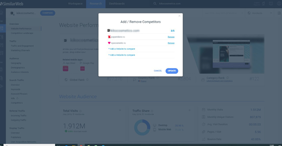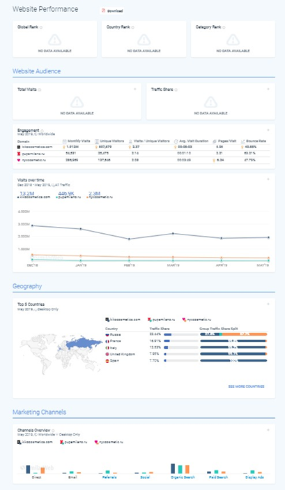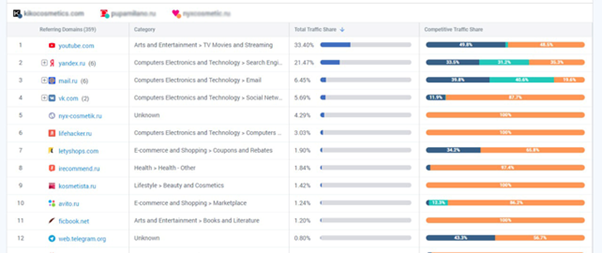 Возьмем сайт компании по продаже косметики и двух конкурентов примерно того же ценового сегмента и популярности (можно добавлять до 5 сайтов включительно).