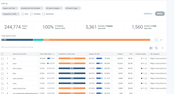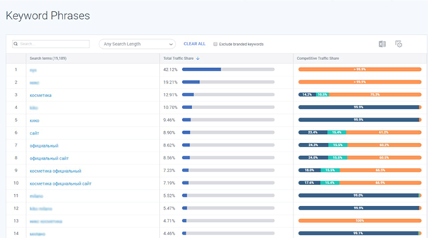В строке поиска можно исключить какой-то запрос или, наоборот, посмотреть информацию только по определенной фразе или по созданной группе ключевых фраз. Так можно увидеть, сколько брендового трафика отбирает конкурент.