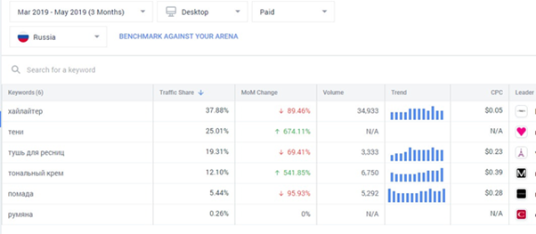 В подразделе Keywords содержится информация о доли трафика, ключевых словах в органике и платном поиске. Мы получаем ее с помощью ключевых слов в сравнении со всем Рунетом и соотношением получаемого трафика каждой компанией.