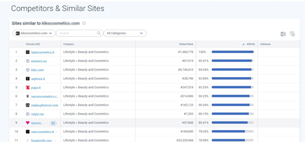 Здесь будут показаны сайты одной категории, предлагающие одинаковую услугу или товар и похожие на интересующий нас сайт (например, все застройщики в категории «Недвижимость»). И таким образом можно определить конкурентов. Располагаются сайты по убыванию степени схожести.
