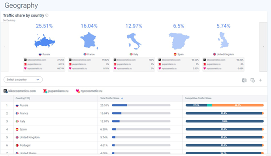 - Website Audience Analysis – общий обзор аудитории ваших конкурентов, включая демографию, геолокацию, показатели вовлеченности, а также долю трафика на десктопе и мобайле.