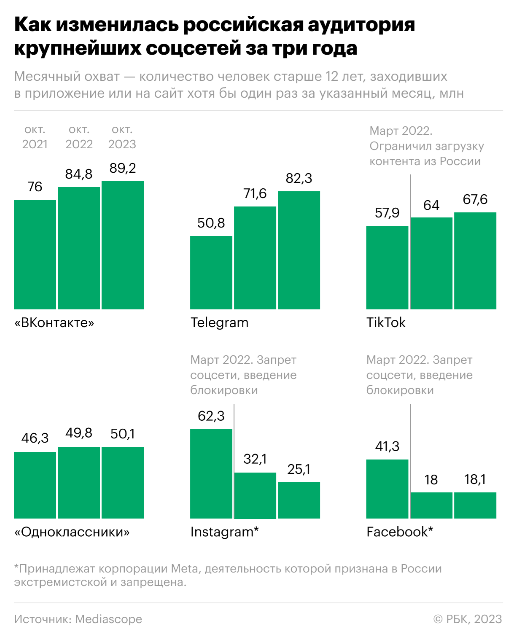 Российская аудитория Telegram увеличилась более чем на 30 млн человек за последние пару лет (82,3 млн в октябре 2023 года против 50,8 млн в октябре 2021-го). По размеру аудитории платформа практически сравнялась с VK, куда в октябре 2023 года заходили хотя бы раз 89,2 млн пользователей.