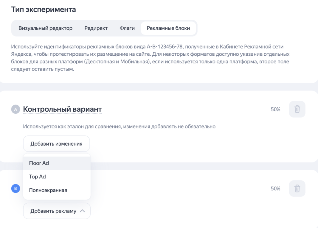 В Метрике появился новый тип A/B-тестов — «Рекламные блоки». Он доступен в «Экспериментах» на базе технологии Varioqub. С помощью теста паблишеры могут без помощи разработчиков анализировать, как рекламные блоки влияют на аудиторию сайта.