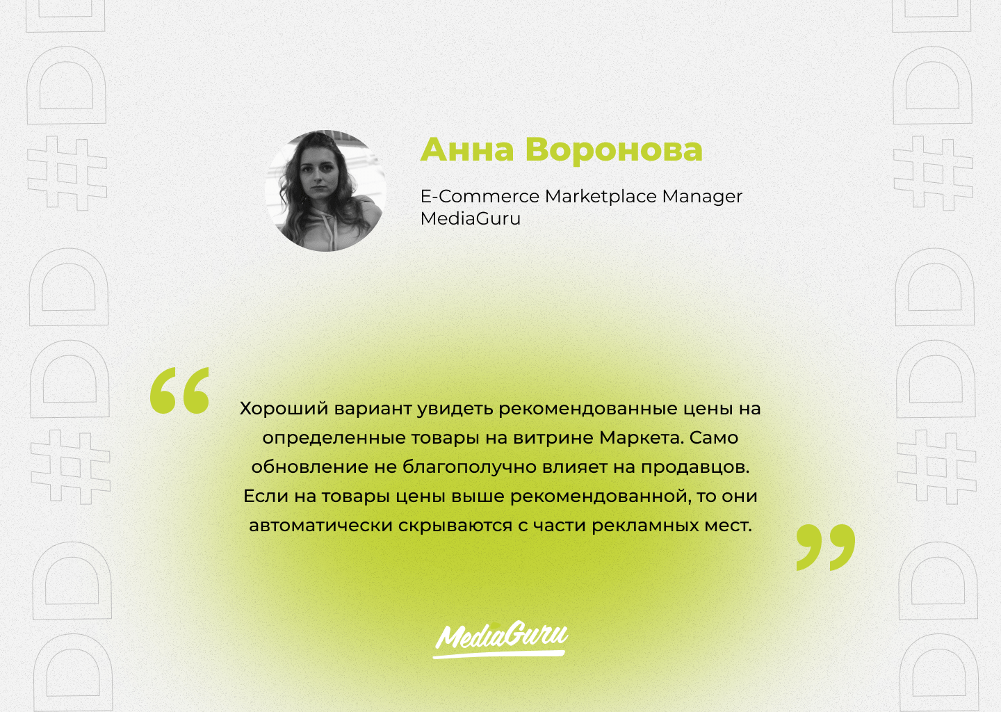 Хороший вариант увидеть рекомендованные цены на определенные товары на витрине Маркета. Само обновление не благополучно влияет на продавцов. Если на товары цены выше рекомендованной, то они автоматически скрываются с части рекламных мест. Также стоит учитывать, что не всем продавцам есть выгода снижать стоимость товара на 10% и более. При этом снижение цены не гарантирует показы на рекламных местах, поскольку ставка у конкурента может быть выше.
