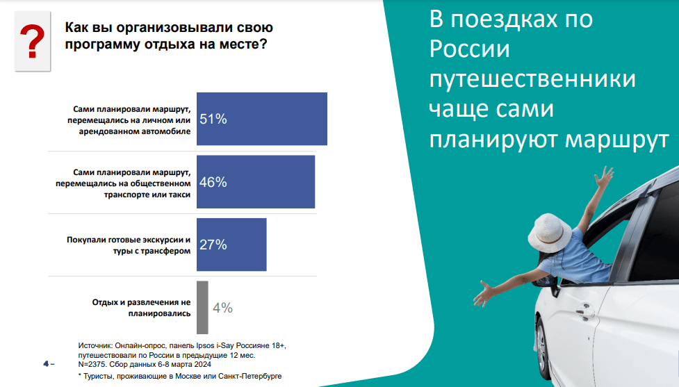 По данным исследования, 79% опрошенных совершали поездки по России за последние 12 месяцев. Большинство путешественников (71%) покупают упакованные продукты питания, чтобы питаться в поездке; 64% опрошенных покупали непродовольственные товары, 58% – готовую еду на вес в кулинарии магазина. Каждый второй покупал продукты питания или непродовольственные товары на сувениры. Чаще всего с собой увозят сладости и сыры.