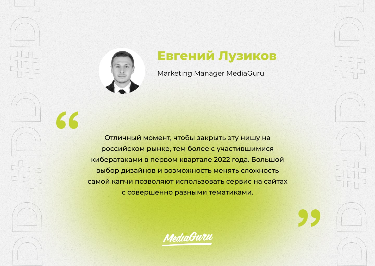 Отличный момент, чтобы закрыть эту нишу на российском рынке, тем более с участившимися кибератаками в первом квартале 2022 года. Большой выбор дизайнов и возможность менять сложность самой капчи позволяют использовать сервис на сайтах с совершенно разными тематиками.