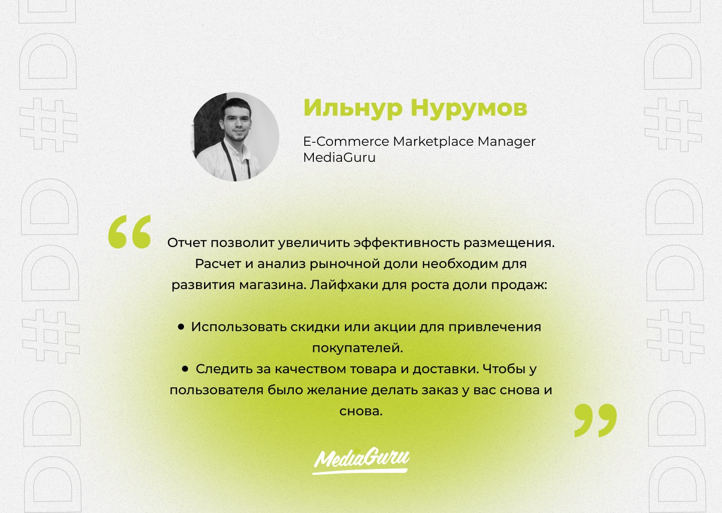 Отчет позволит увеличить эффективность размещения. Расчет и анализ рыночной доли необходим для развития магазина. После того как магазин вычислит свою долю рынка, он сможет оценить текущее положение и проанализировать: цены и скорректировать до конкурентоспособных;