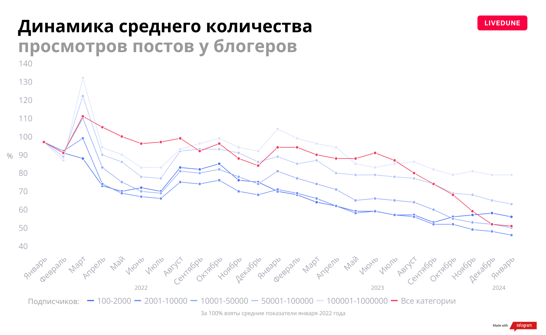 Коэффициент Reach Rate, демонстрирующий соотношение среднего охвата постов к количеству подписчиков, в январе 2024-го у брендов составил 55% от доблокировочных показателей, у блогеров — 68%.