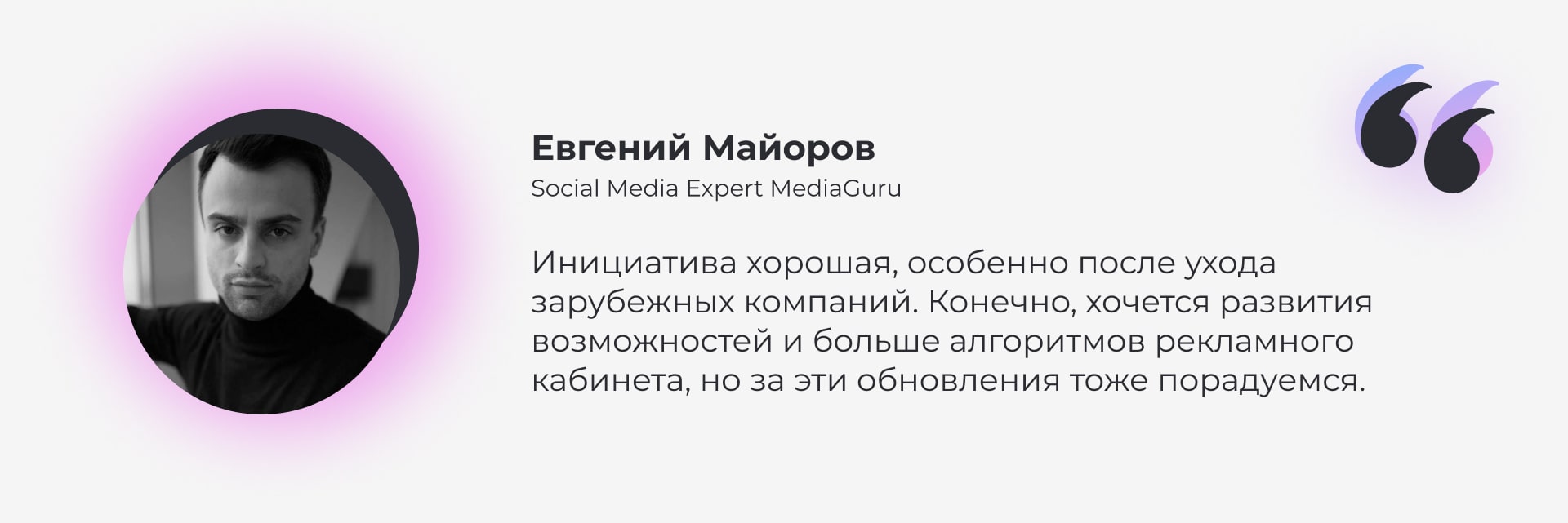 Инициатива хорошая, особенно после ухода зарубежных компаний. Конечно, хочется развития возможностей и больше алгоритмов рекламного кабинета, но за эти обновления тоже порадуемся.