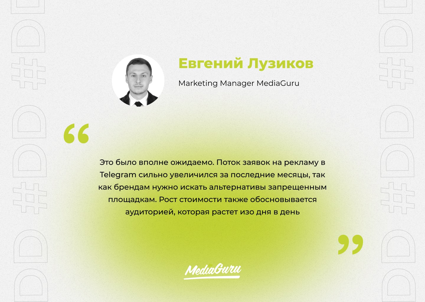 Это было вполне ожидаемо. Поток заявок на рекламу в Telegram сильно увеличился за последние месяцы, так как брендам нужно искать альтернативы запрещенным площадкам. Рост стоимости также обосновывается аудиторией, которая растет изо дня в день.