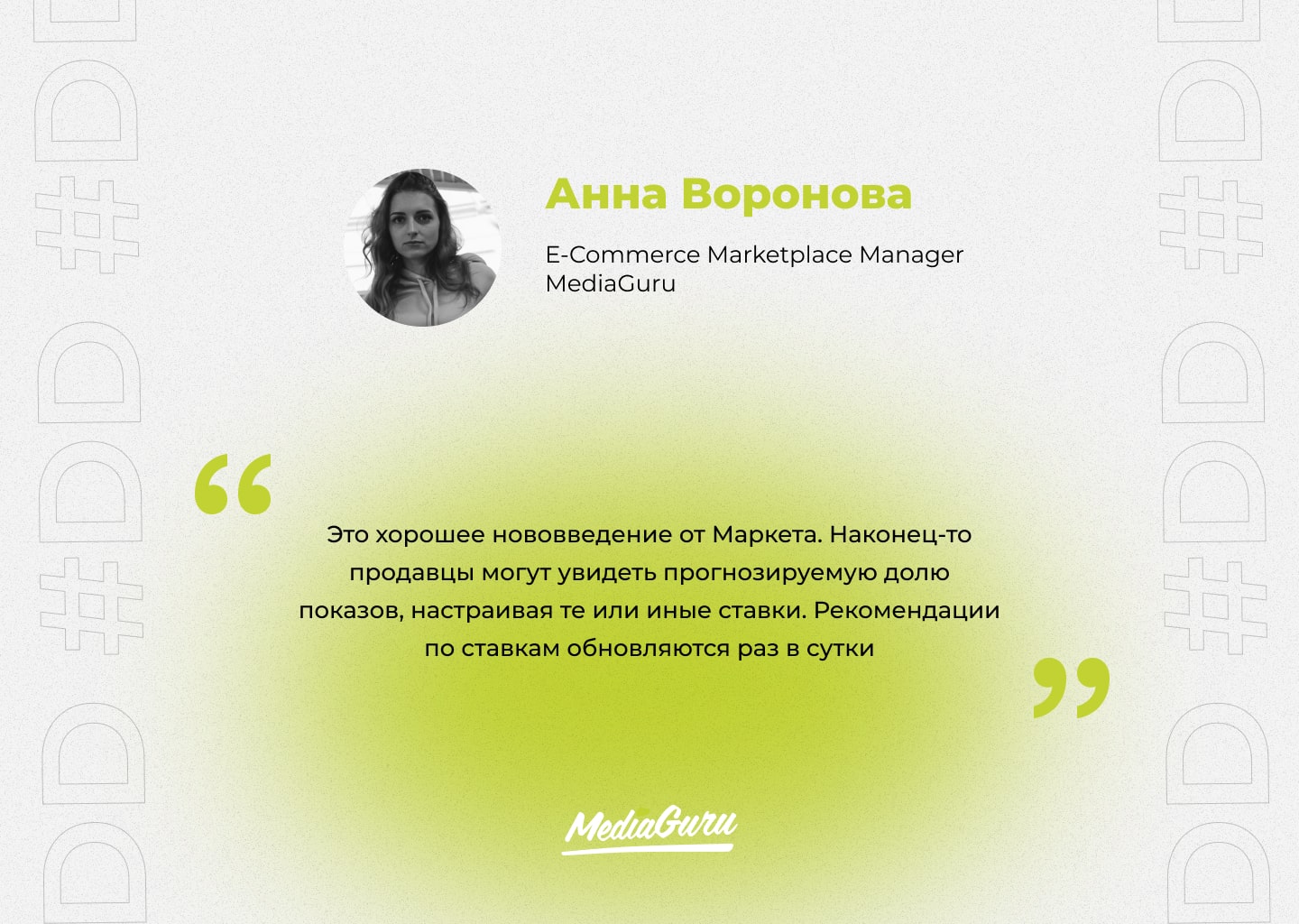 Это хорошее нововведение от Маркета. Наконец-то продавцы могут увидеть прогнозируемую долю показов, настраивая те или иные ставки. Рекомендации по ставкам обновляются раз в сутки. По данным исследования Яндекс Маркета, в сравнении с контрольной группой рост заказов составил 42,8% для товаров, которые раньше не продвигались совсем, и 24,6% для товаров, у которых подняли ставки до рекомендованных. Аукцион ставок будет коррелироваться в зависимости от ставок конкурентов и от количества конкурентов.