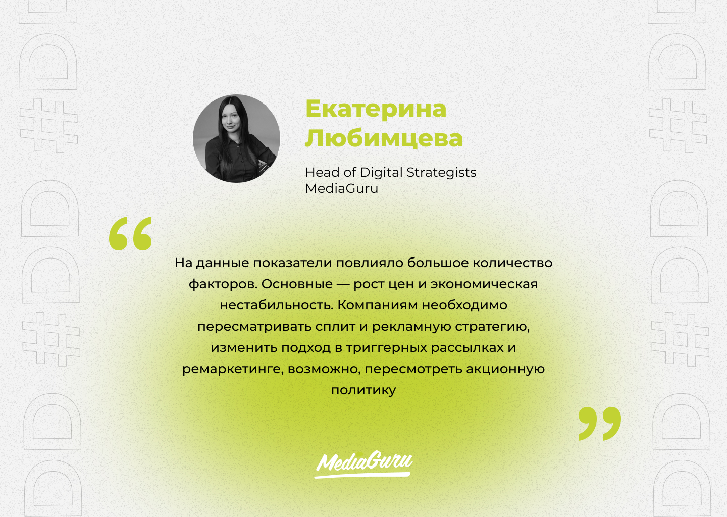 На данные показатели повлияло большое количество факторов. Основное — рост цен и экономическая нестабильность. Исходя из сложившейся ситуации, компаниям необходимо пересматривать сплит и рекламную стратегию, изменить подход в триггерных рассылках и ремаркетинге, возможно, пересмотреть акционную политику. В сплите необходимо задействовать маркетплейсы (сейчас любой бизнес может подобрать рентабельную схему ведения) и размещать рекламу, например, на Авито, где сейчас уже выросло количество рекламодателей.