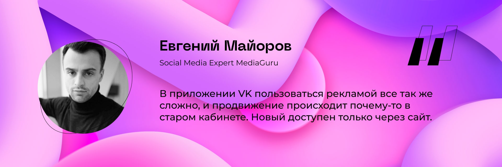 В приложении VK пользоваться рекламой все так же сложно, и продвижение происходит почему-то в старом кабинете. Новый доступен только через сайт.