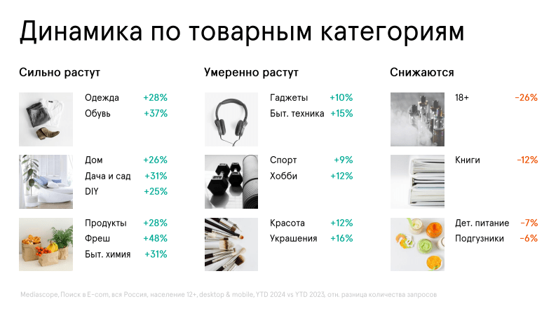 - растут запросы на следующие товарные категории: одежда и обувь, дом, дача и сад, DIY, продукты, фреш, бытовая химия. Снижается – товары 18+, книги, подгузники и детское питание;