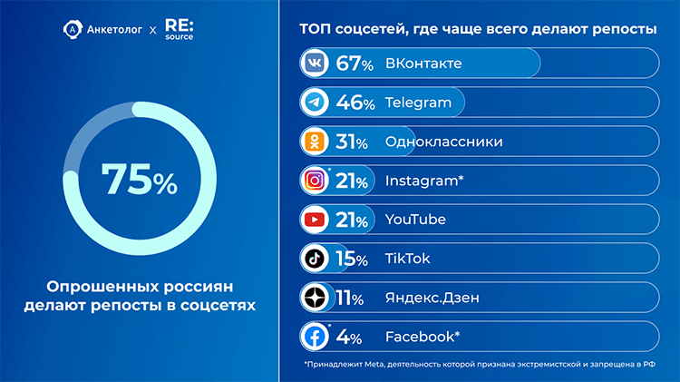 Большинство (75%) опрошенных россиян делают репосты в соцсетях. Среди них 57% любят делиться интересным контентом с друзьями – чаще всего это мемы и юмор, а наибольшей популярностью среди площадок пользуется соцсеть VK (67%).