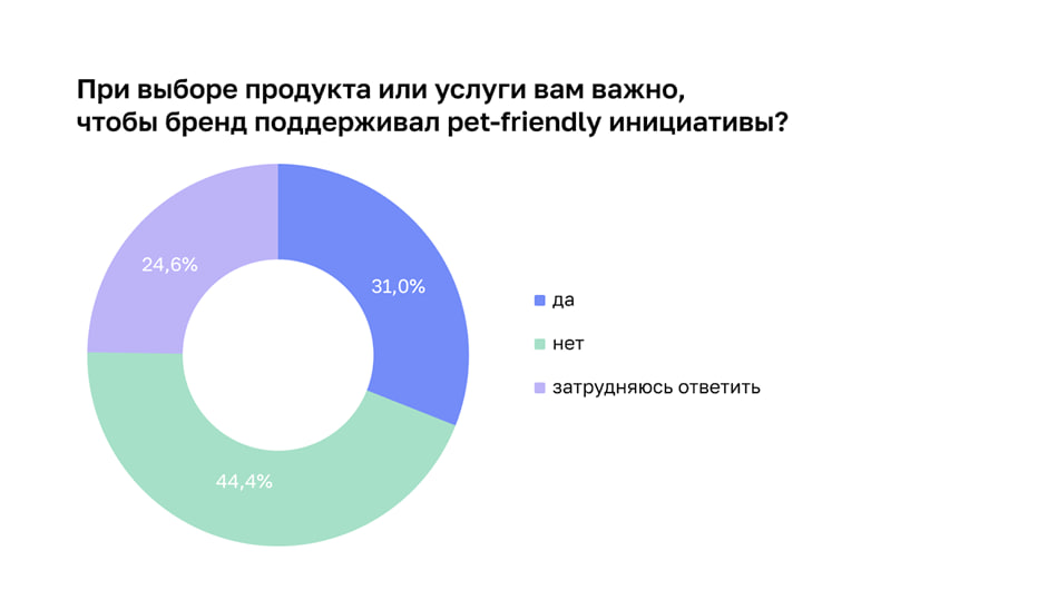 Почти каждый третий опрошенный россиянин (31%) заявил, что на его отношение к бренду влияет то, как компания реализовывает или поддерживает pet-friendly инициативы. Однако 44% респондентов сообщили, что это никак не действует на их выбор товаров или услуг. Четверть затрудняется оценить роль pet-friendly проектов в отношении к брендам.