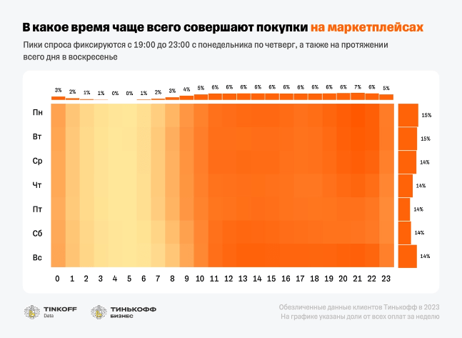 Тинькофф Бизнес и Tinkoff Data провели исследование и узнали, в какое время суток чаще всего делают покупки в различных сферах — в офлайн-магазинах, на маркетплейсах, в общепите и службах доставки.