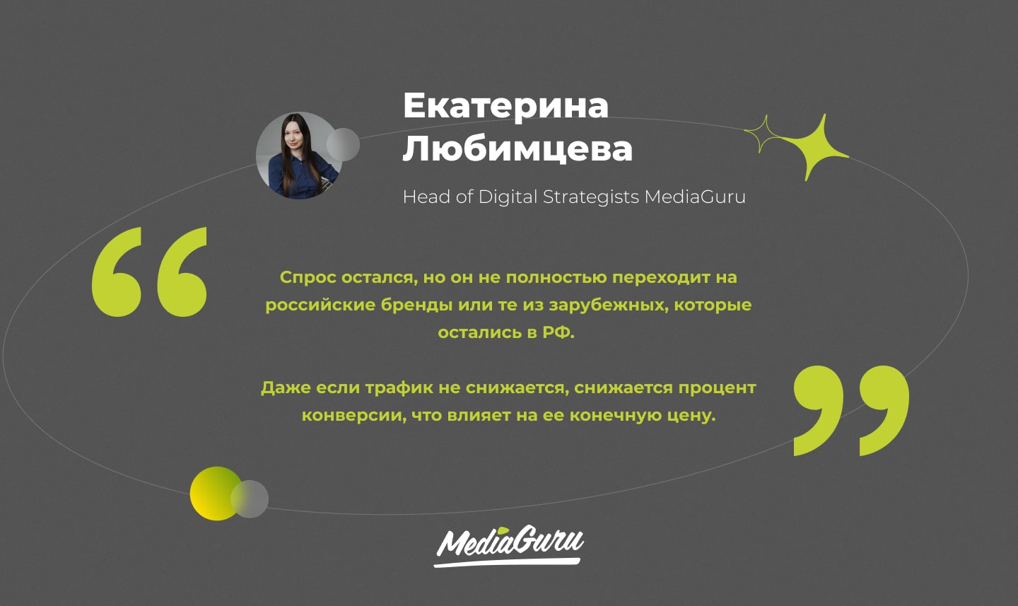 Екатерина Любимцева, Head of Digital Strategists MediaGuru, прокомментировала ситуацию: «Ожидания россиян также сказываются и на динамике рынка рекламы в этих тематиках. Спрос остался, но он не полностью переходит на российские бренды или те из зарубежных, которые остались в РФ. Даже если трафик не снижается, снижается процент конверсии, что влияет на ее конечную цену. Из-за этого необходимо прорабатывать иные сценарии рекламных стратегий».