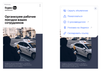 Теперь на баннерах в РСЯ можно увидеть 3 точки, при нажатии на которые откроется меню: