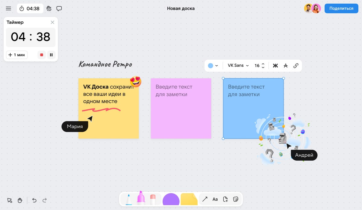 VK Доска — это сервис для совместной работы, который позволяет создать неограниченное количество виртуальных досок и визуализировать информацию. Пользователи могут делиться идеями с коллегами, делиться задачами, отслеживать прогресс.