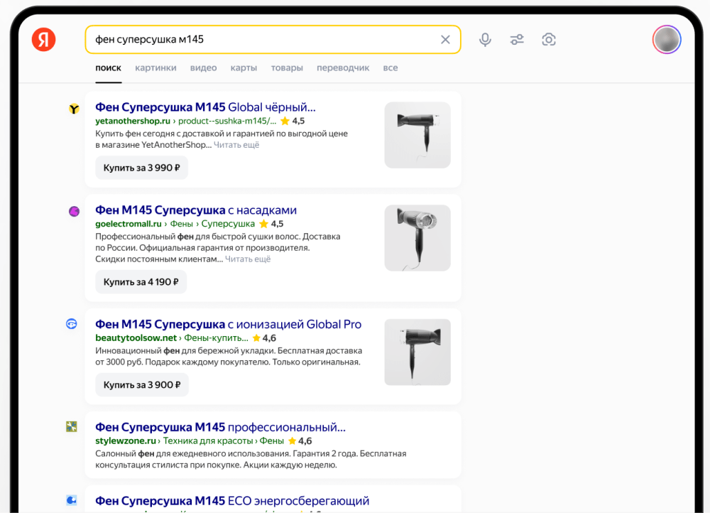 Яндекс улучшил ответы на запросы, связанные с поиском товаров. Пользователи могут увидеть в выдаче цены и изображения продуктов и перейти на сайт магазина для оформления заказа.