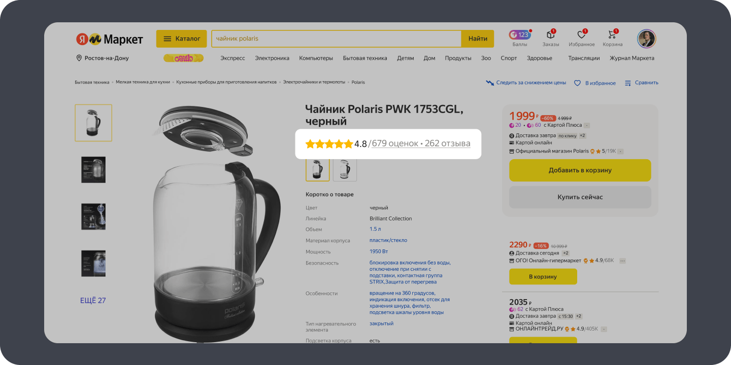 4) Яндекс Маркет начал показывать на карточке сначала отзывы покупателей магазина.