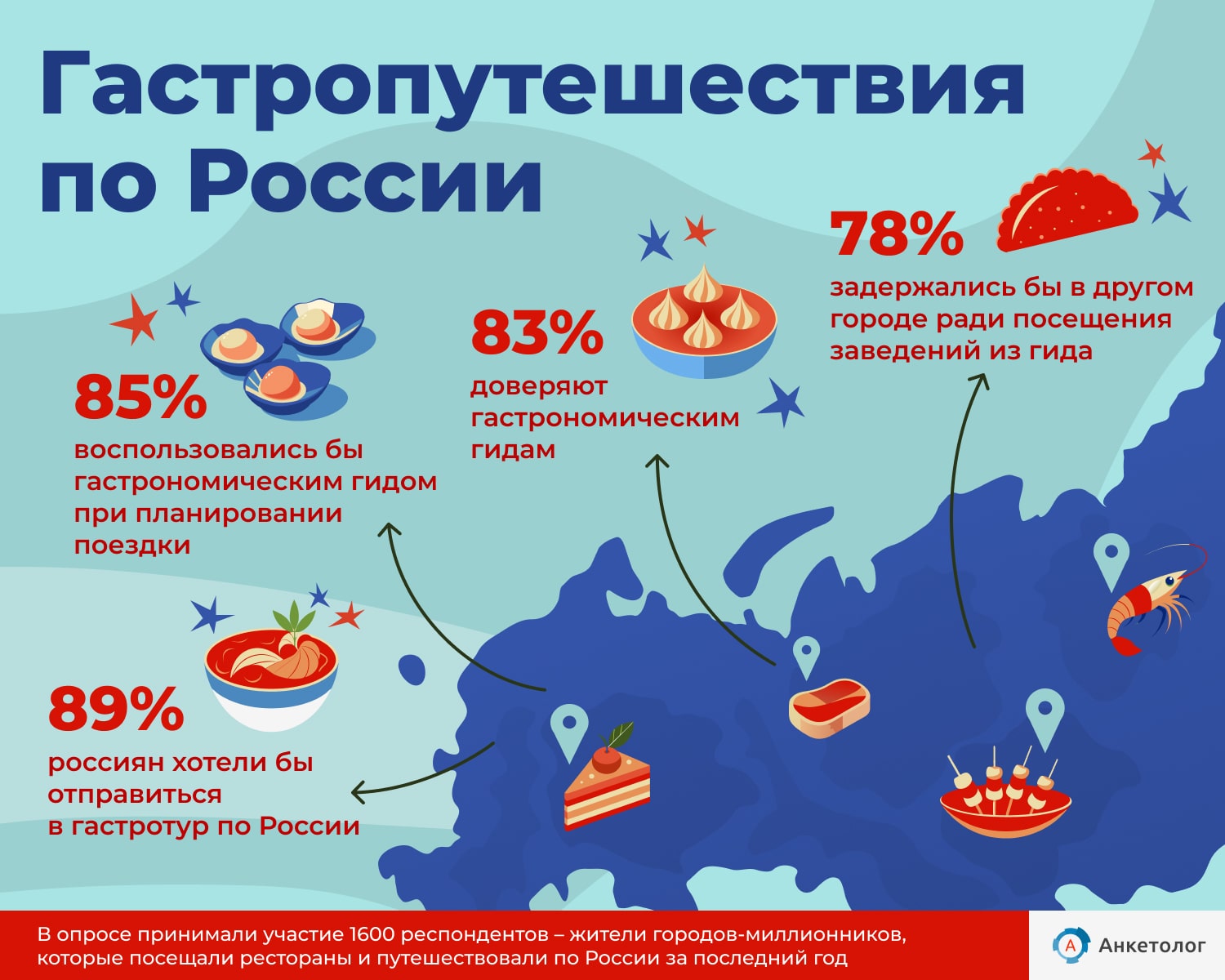 Во время путешествий большинство россиян посещают локальные заведения питания, пробуя как местную кухню, так и привычные для себя блюда (92%). 86% респондентов ходят в кафе или закусочные, а 68% обедают в ресторанах. Причем каждый второй, кто посещает кафе и закусочные во время путешествий, делает это раз в день (50%), каждый четвертый — несколько раз в день (26%).