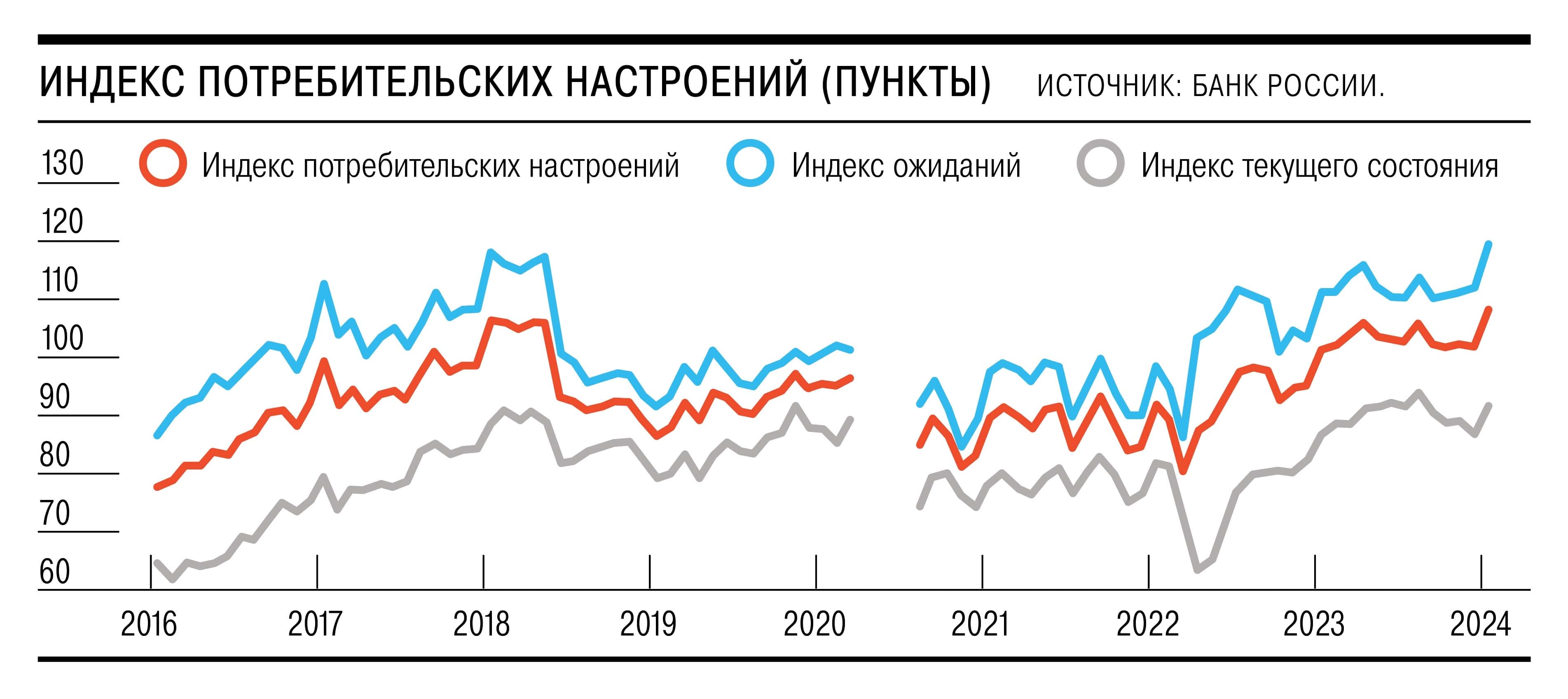 Индекс потребительских настроений, который определяет Банк России, обновил исторический максимум в январе 2024 г. В этом месяце были зафиксированы аномально высокие траты домохозяйств. Всего индекс прибавил 6,4 пункта (и 6,8 пункта в годовом выражении) и вырос до 108,2 пункта.