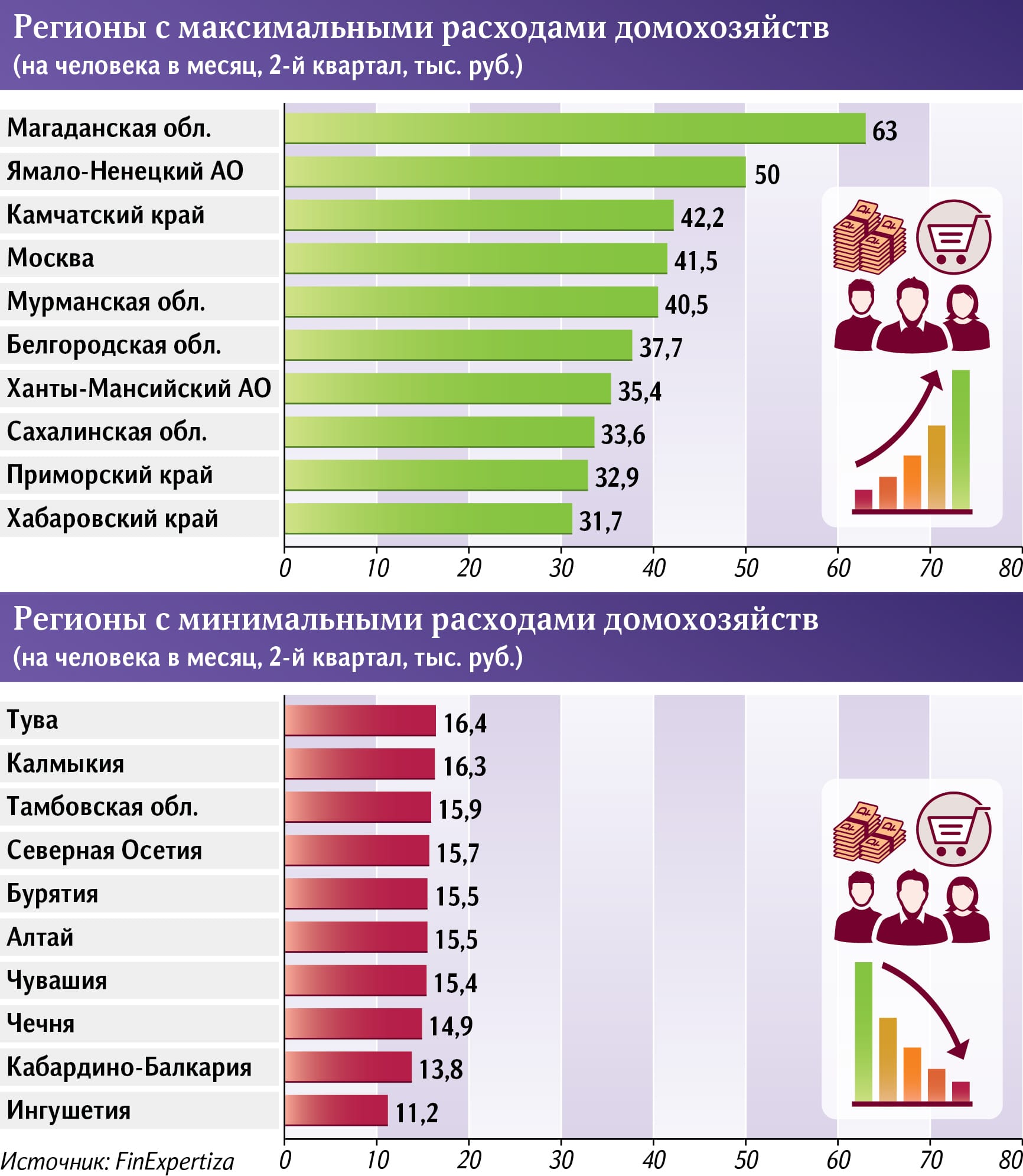 Во II квартале в реальном выражении расходы поднялись на 7%, до 24,9 тыс. на человека. В отдельных регионах этот показатель вырос до 63 тыс. руб. или сократился до 20,7 тыс. руб.