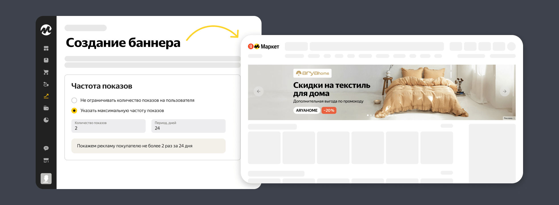 Маркет расширил возможности в настройке продвижения с помощью баннеров. Теперь продавцы могут задать количество показов одному пользователю, а также выбрать период, в который он его увидит, например, не больше трех раз в неделю.