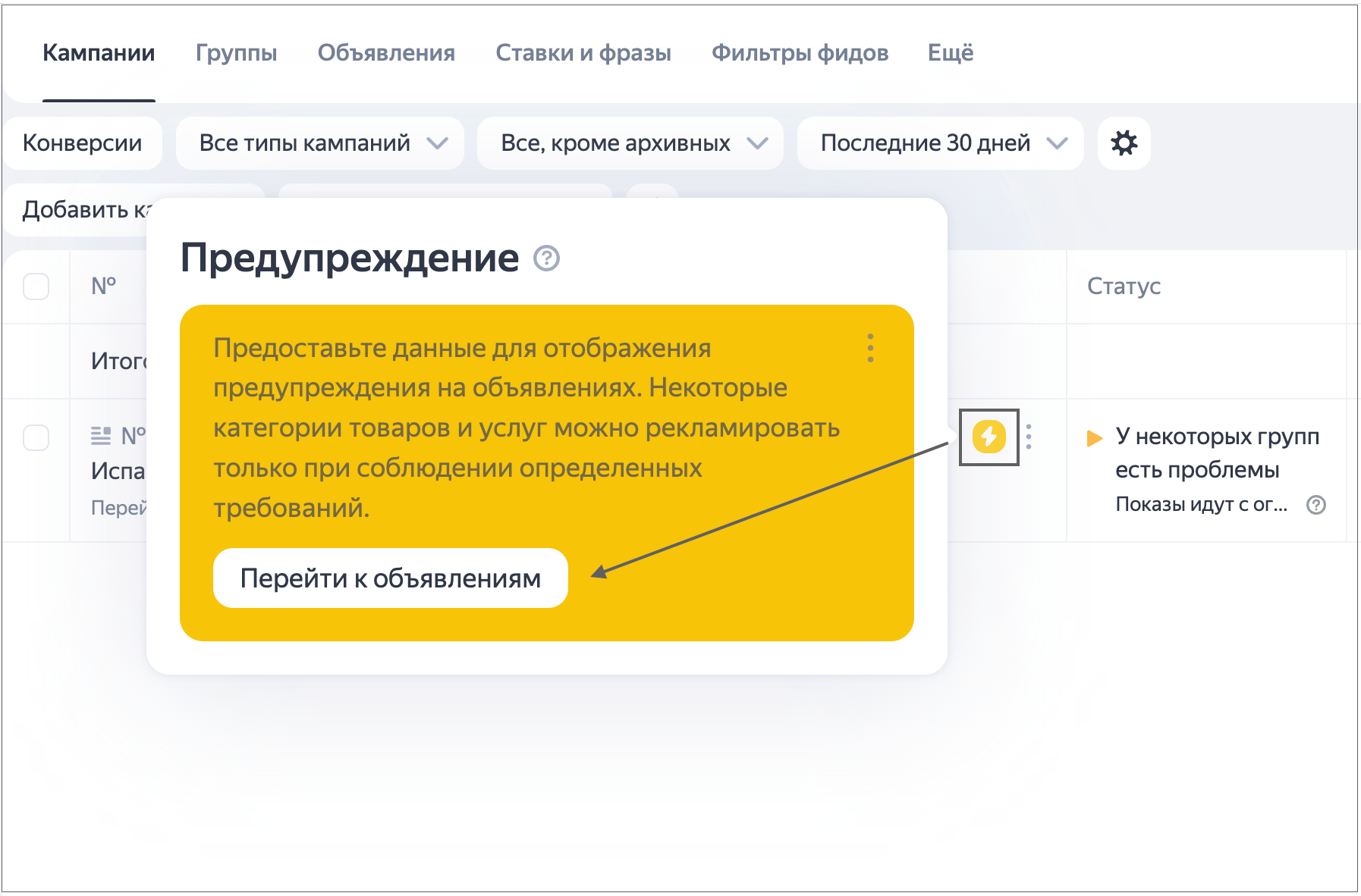 По закону «О рекламе», такие объявления должны иметь предупреждения. Система создает их автоматически для текстовых объявлений, но для этого ей необходима информация о компании, оказывающей услуги.