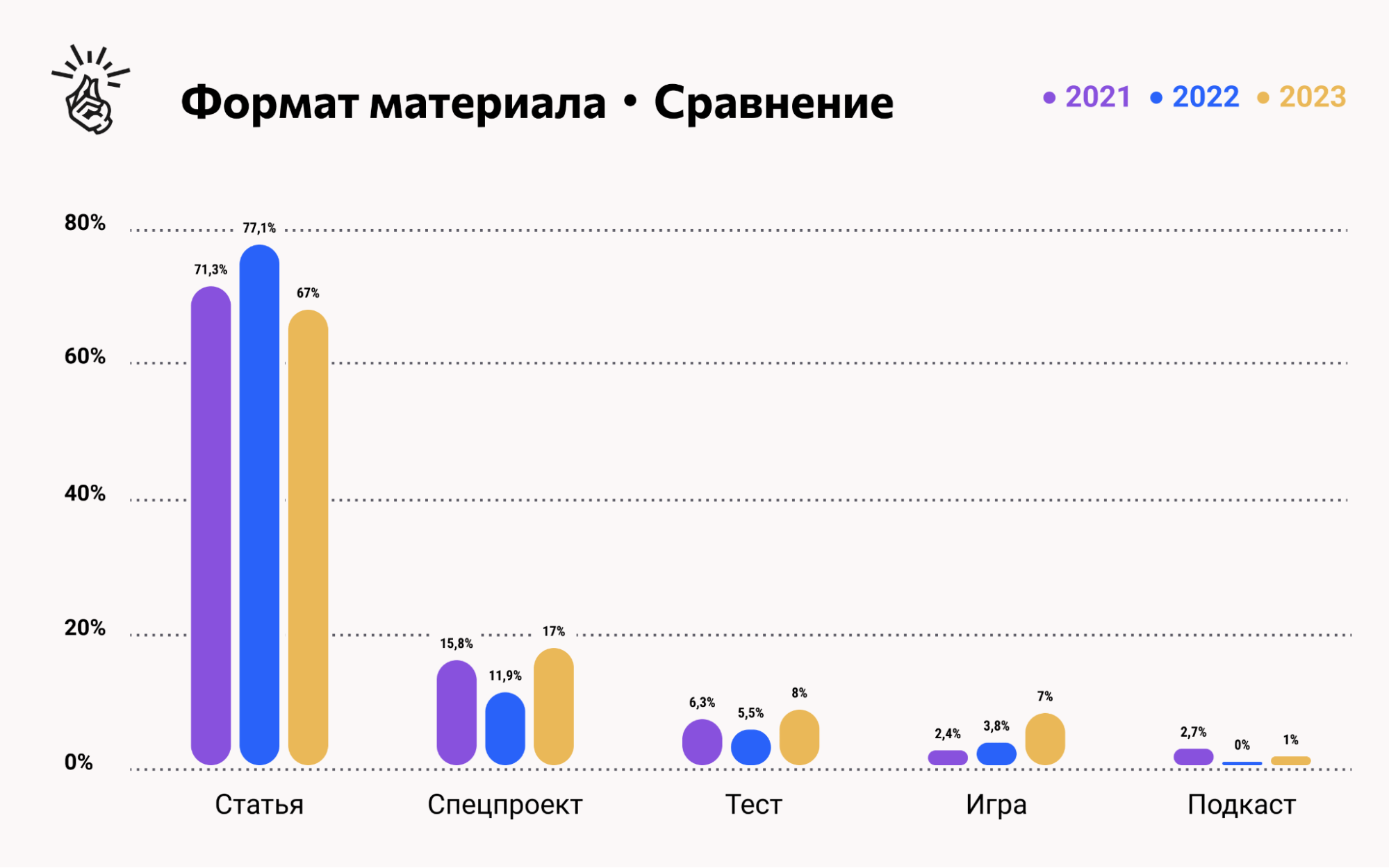 • востребованные форматы: статьи, спецпроекты, тесты;