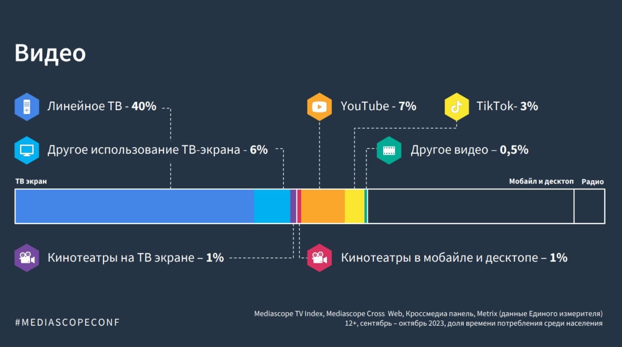 Если говорить про всё население страны в целом, то телеэкран доминирует по доле времени потребления (40%) преимущественно за счёт линейного просмотра каналов. Среди онлайн-площадок лидируют YouTube (7%) и TikTok (3%). Другие видеоплощадки, включая онлайн-кинотеатры, составляют ещё около 3%.