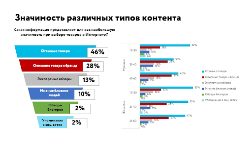 Согласно данным исследования агентства «Ашманов и партнеры», почти половина опрошенных онлайн-покупателей (46%) считают отзывы наиболее значимой информацией при выборе товаров. Второй по важности для потребителей тип информации (описания товаров и брендов) — 28%. На третьем месте ― экспертные обзоры (13%), а на четвертом ― мнение близких людей (10%).