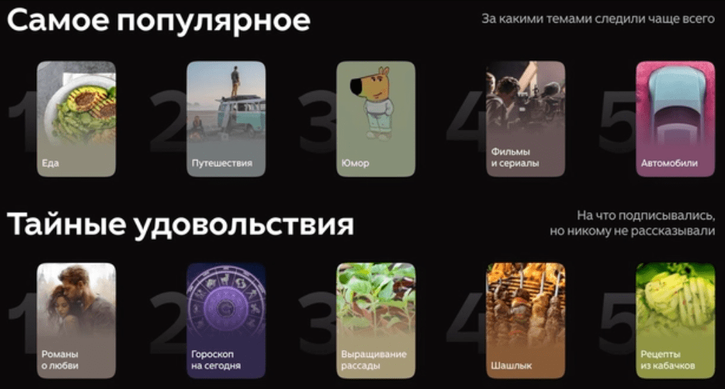 Самые популярные тематики возглавили «Еда» (6+ млн подписчиков), «Путешествия», «Юмор» и «Кино», а в «тайные подписки» попали любовные романы, гороскопы и садоводство.