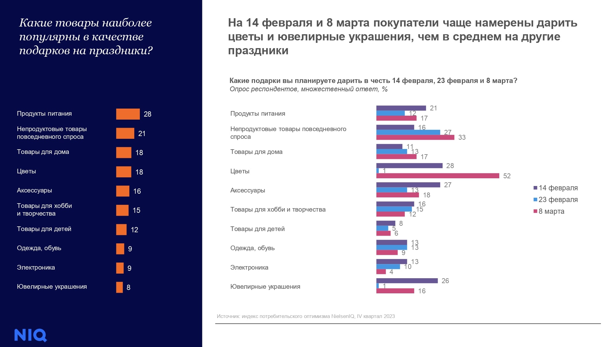 Опрос NielsenIQ показал, что люди готовы потратить на подарки в предстоящие весенние праздники (23 февраля, 8 марта) в среднем более 13,5 тыс. руб. Из них около 3,5 тыс. руб. — на 23 февраля и 6 тыс. руб. — на 8 марта.
