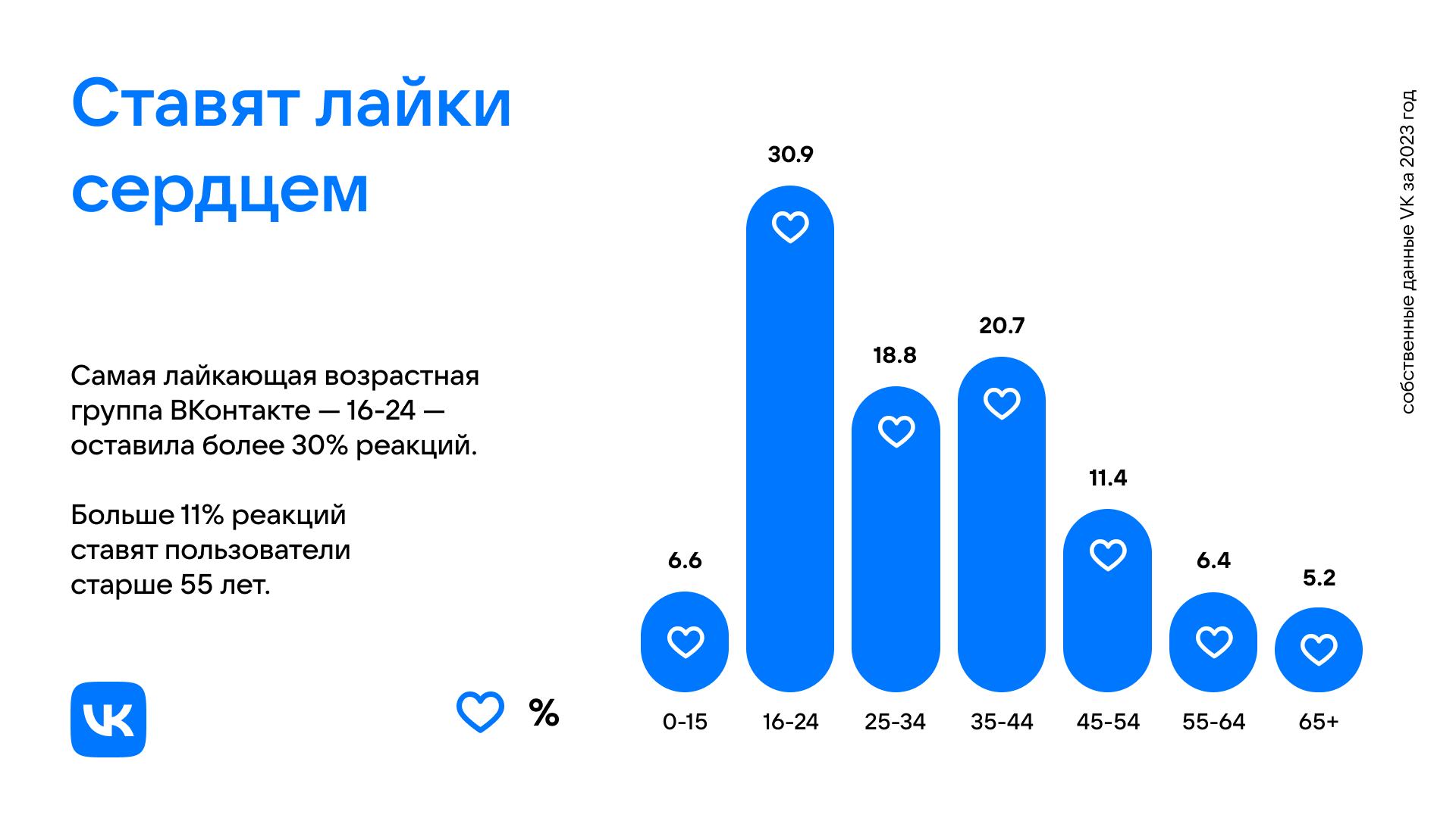 - самой лайкающей возрастной группой остается молодежь в возрасте 16-24 года, она ставит около трети от всех реакций в соцсети;