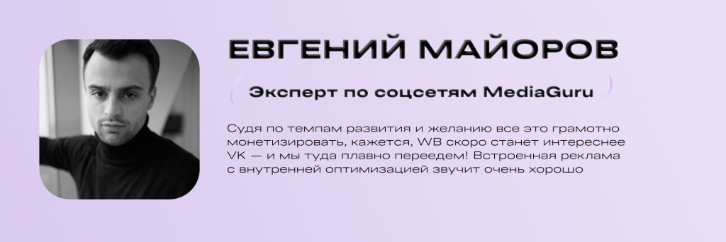 Судя по темпам развития и желанию все это грамотно монетизировать, кажется, WB скоро станет интереснее VK — и мы туда плавно переедем! Встроенная реклама с внутренней оптимизацией звучит очень хорошо.