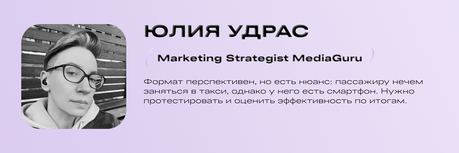 Этот формат кажется интересным. В такси порой нечем себя занять, поэтому внимание пассажира, скорее всего, мы привлечем. С другой стороны, у каждого есть смартфон, и большинство, вероятно, будет сидеть в нем. Протестировать новинку стоит, а дальше по результатам тестов и на их основе делать вывод об эффективности этого инструмента.