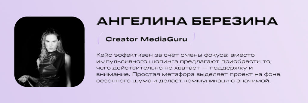 Кейс классно работает за счет смены фокуса: вместо привычного импульсивного шопинга зрителю предлагают купить то, чего действительно не хватает — поддержку, внимание, закрытые гештальты. Простая, но емкая метафора выделяет проект на фоне сезонного шума и делает коммуникацию значимой, оставляя ощущение настоящего смысла, а не рекламного приема.