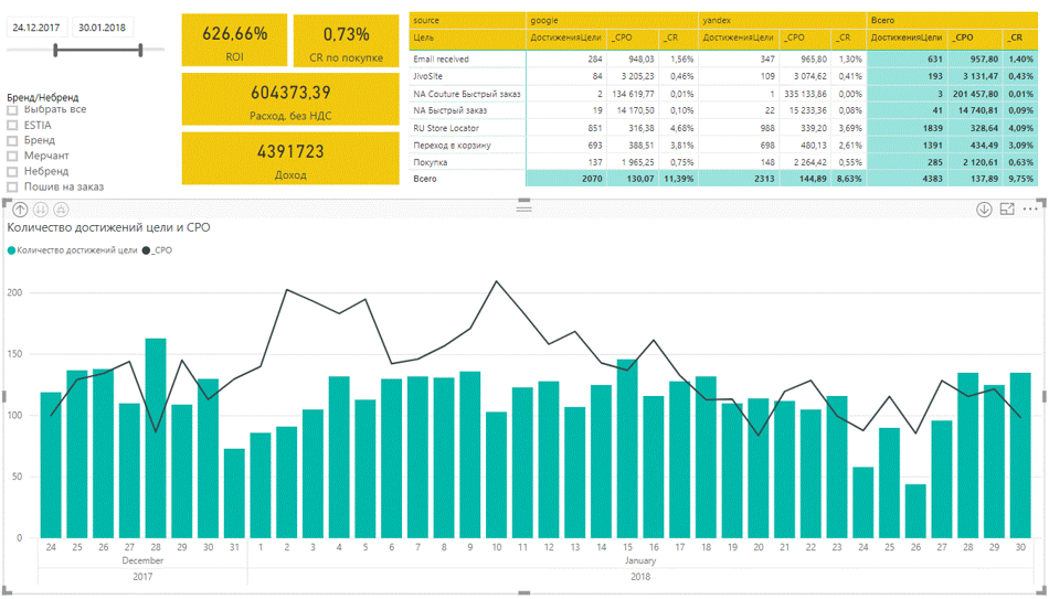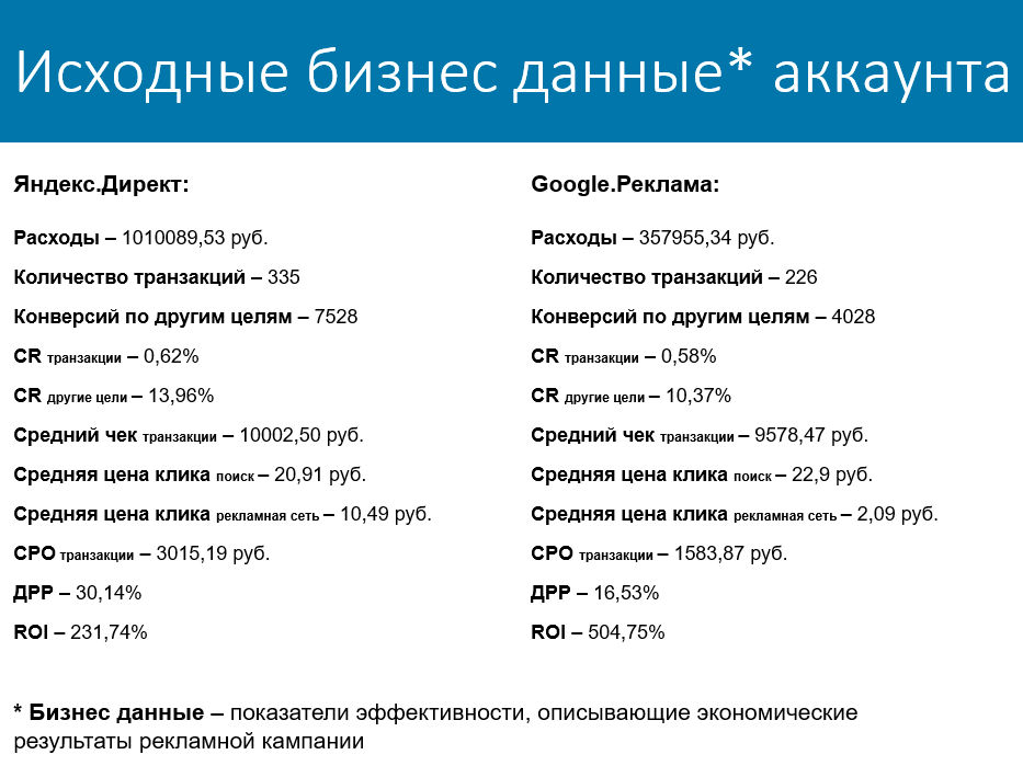 О чем это говорит? Можно заподозрить, что из Яндекса приходит более качественный трафик. Но на самом деле это не так. При анализе синтетические данные носят дополняющий характер, а действительно важные показатели — бизнес-данные. Именно по ним можно определить, приносит рекламный канал прибыль или нет, поэтому к ним мы и обращаемся.
