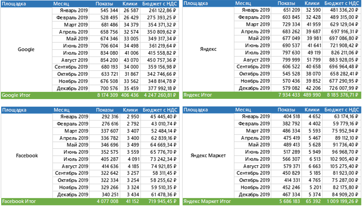 - бюджет делится в пропорции: 74% — Яндекс, 26% — Google;