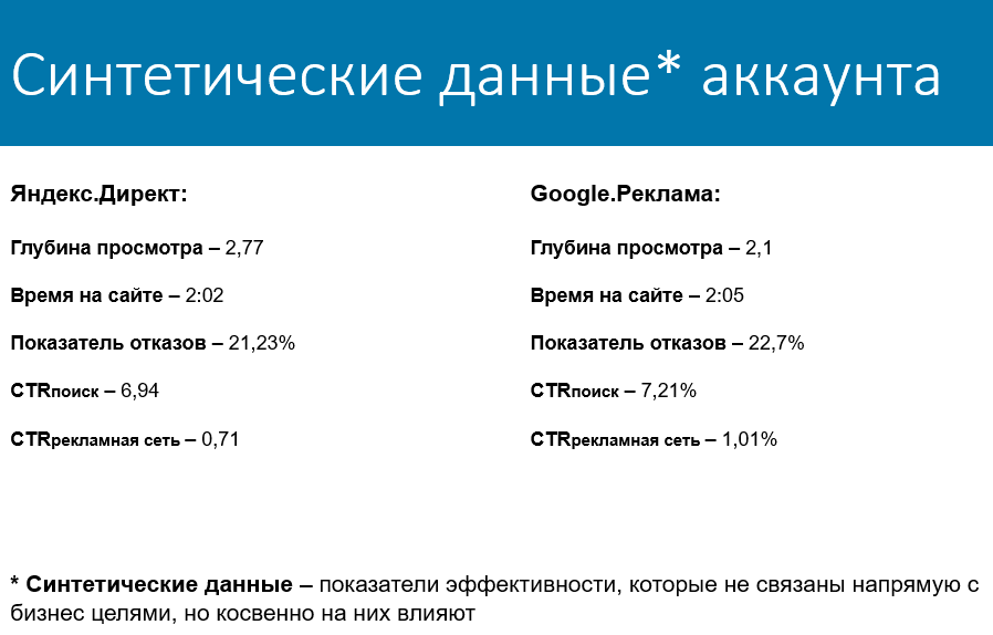 Пример: post-view показатели (глубина и время на сайте, количество отказов) в Яндекс.Директе лучше, чем в Google.Рекламе, а кликабельность у объявлений — хуже.