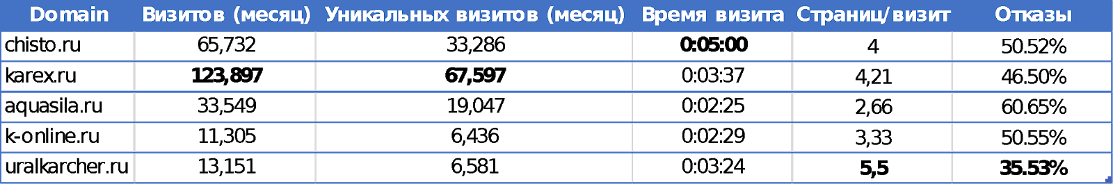 С помощью сервиса similarweb.com мы отслеживаем основных конкурентов, похожих на нас. Например, для сайта chisto.ru, который продает бытовую и профессиональную технику Karcher, можно выделить следующих конкурентов: karex.ru, aquasila.ru, k-online.ru, uralkarcher.ru. Проводим сравнение по синтетическим показателям: