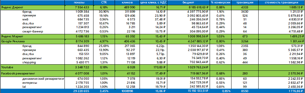 Причина может быть в низкой эффективности РСЯ при том, что клик обходится в 5 раз дороже, чем в Google. Чтобы понять, как эффективно распределить бюджет, нужно посмотреть данные в разрезе мест размещения.