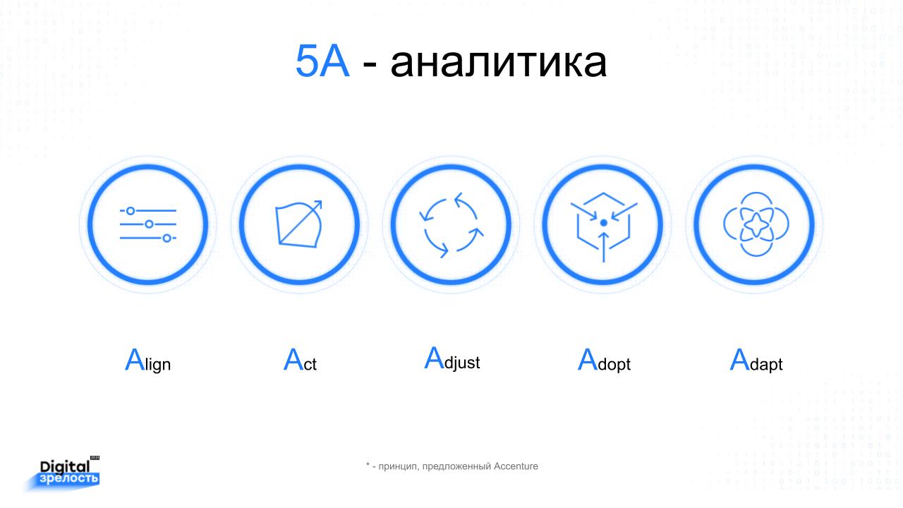 Специалисты изучили причины, которые помешали некоторым бизнесам получить выгоду. Выяснили, что высокоэффективные компании делают намного больше для преодоления внутренних проблем. В результате Accenture сформировали принцип 5A в аналитике больших данных.